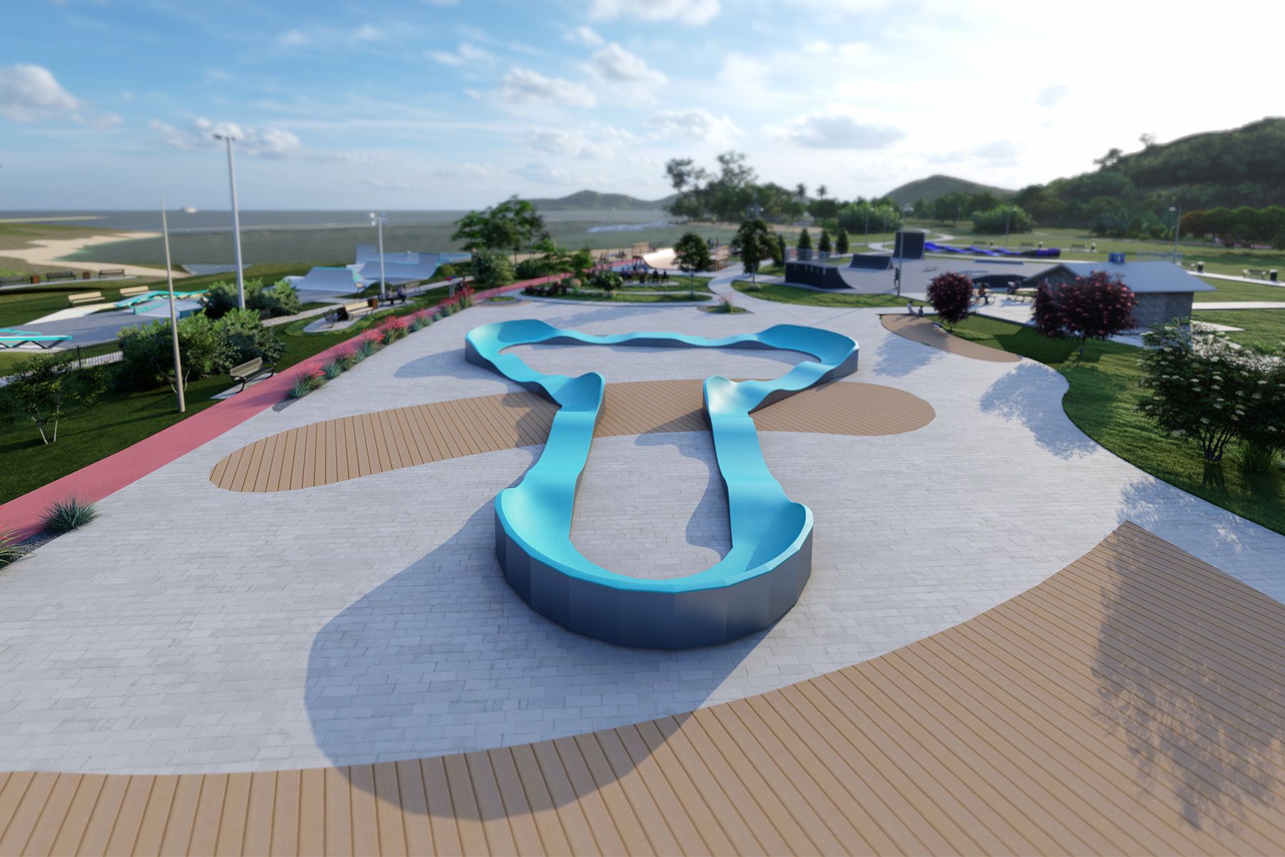 El pumptrack COVE TF007, de 63,2 m de longitud, es un carril bici modular diseñado para bicicletas, monopatines, patines en línea y patinetes. El trazado de la pista se basa en una secuencia rítmica de moguls y giros que permiten mantener la velocidad haciendo trabajar el cuerpo adecuadamente, sin tener que pedalear ni empujar. Gracias a su clara geometría, la pista es de uso intuitivo y funciona bien tanto para principiantes como para usuarios más avanzados.