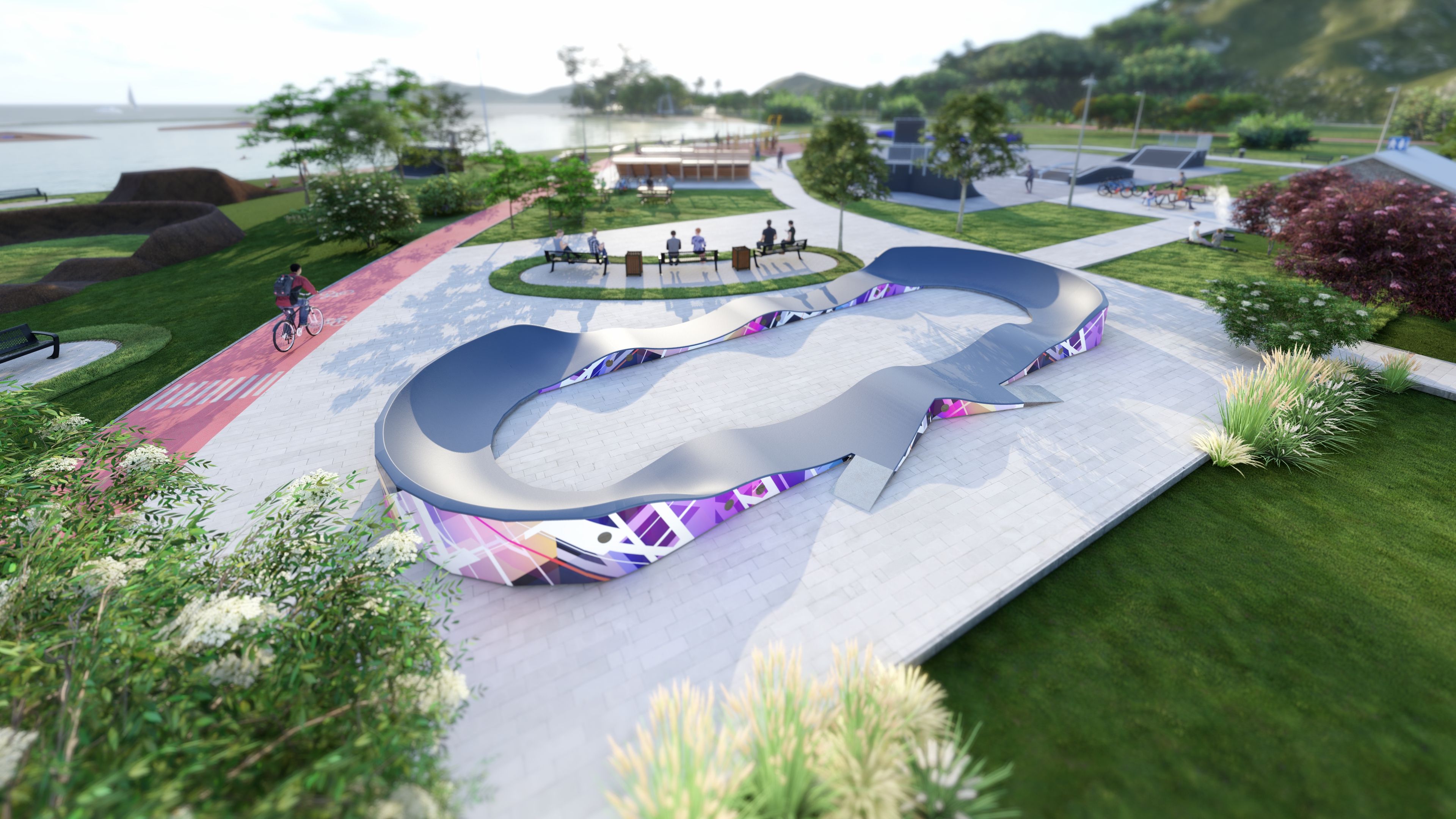 El pumptrack de 40 m de longitud es una versión especial de la pista creada en colaboración con el diseñador gráfico Nawer, cuyo estilo distintivo confiere a la instalación un carácter único y artístico. El diseño combina la funcionalidad del pumptrack con una identidad visual distintiva, de modo que la pista se convierte no sólo en un espacio para montar, sino también en un elemento distintivo del lugar.