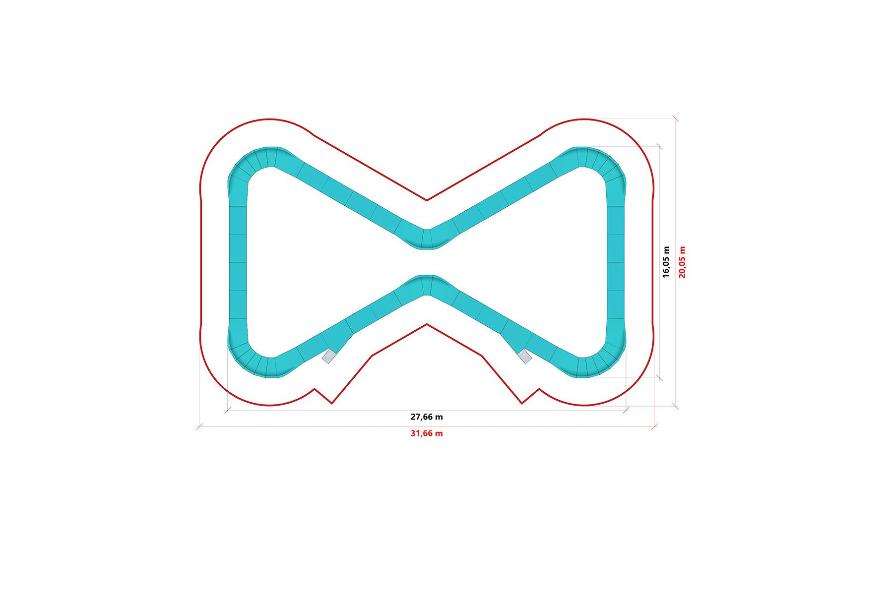 La pista está fabricada con tecnología de acero compuesto, que combina una estructura de acero galvanizado con una superficie duradera con propiedades antideslizantes. Los materiales utilizados garantizan una gran resistencia al uso intensivo y a las condiciones meteorológicas cambiantes, al tiempo que reducen la necesidad de mantenimiento.
