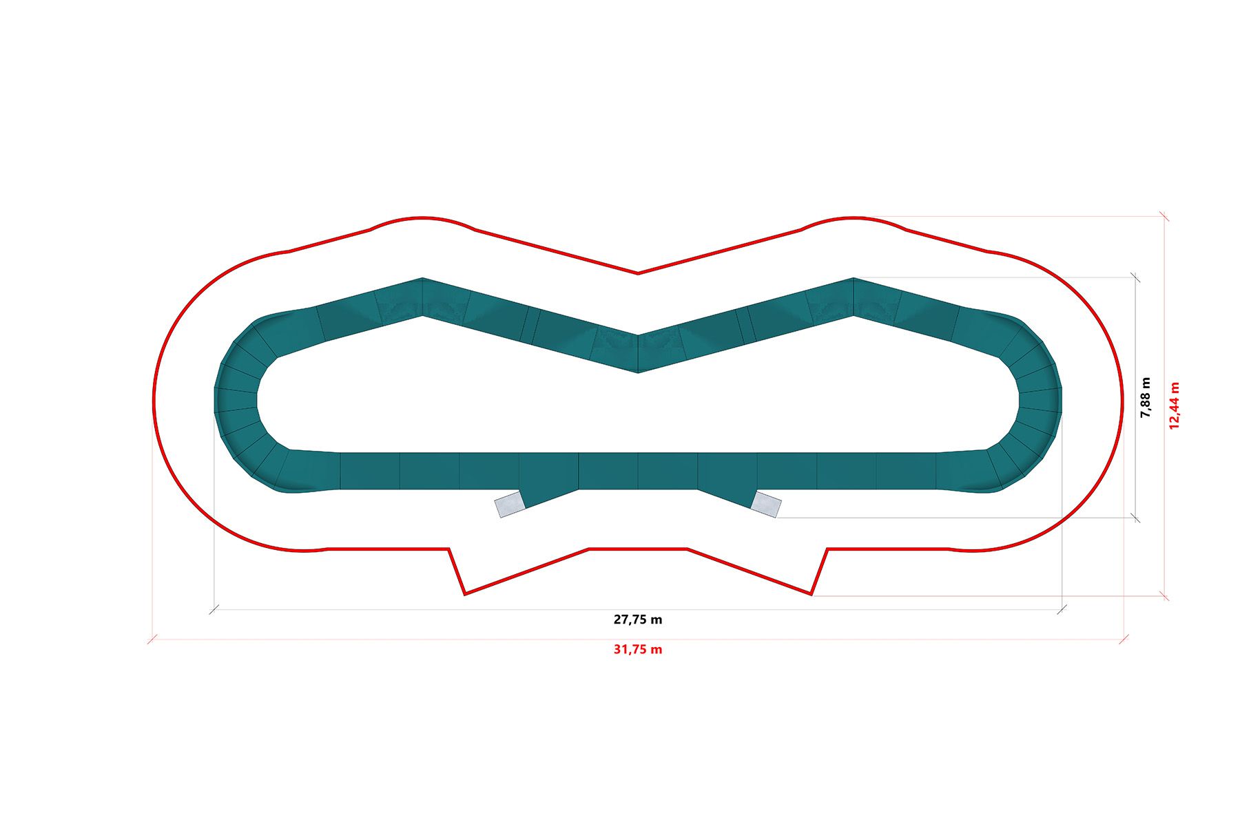 La pista está fabricada con tecnología de acero compuesto, que combina una robusta estructura de acero con una superficie de material compuesto duradero con propiedades antideslizantes. Esta solución garantiza una gran resistencia a las condiciones meteorológicas, una necesidad limitada de mantenimiento y una larga vida útil de la instalación.