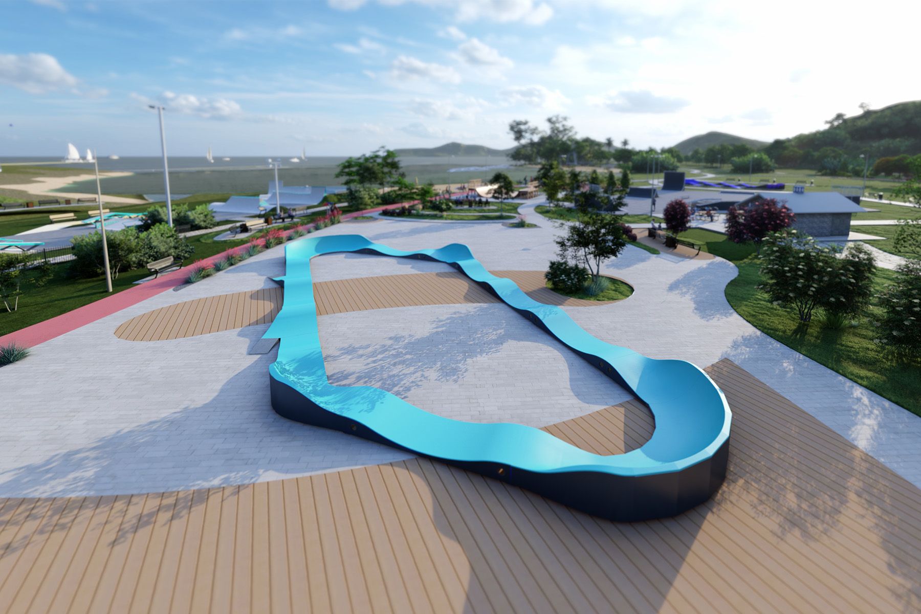 El diseño modular permite una instalación rápida y una posible reconfiguración futura. Gracias a un sistema de pies ajustables, la pista también puede instalarse en terrenos irregulares, lo que permite adaptar la instalación a diferentes espacios recreativos.